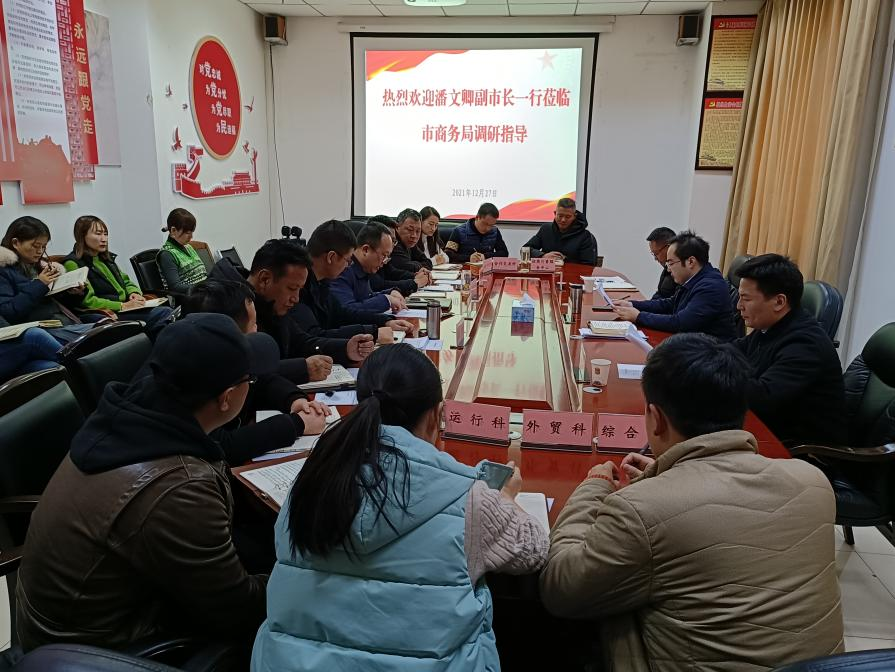 会上,蒋曦就全市商务工作年度指标完成情况、招商引资、对外贸易、消费促进等工作进行了全面汇报。潘文卿认真听取了汇报内容,与商务局班子成员和科室同志亲切交谈,针对目前重点工作详细询问,并就存在的问题和下一步工作计划给予具体指导。