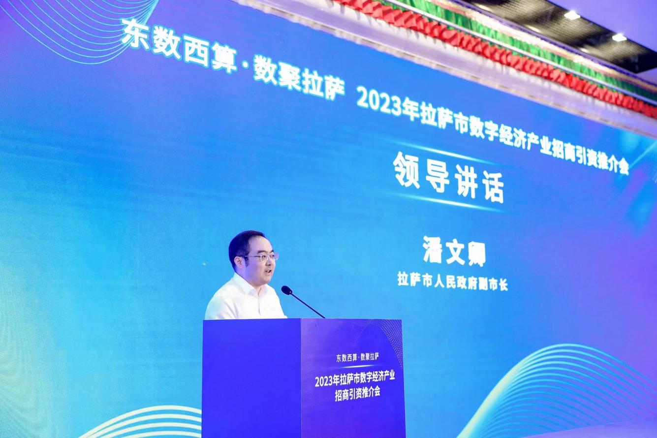 拉萨市人民政府潘文卿副市长讲话。他代表拉萨市人民政府向所有与会领导和嘉宾表示热烈的欢迎和衷心的感谢,向过去、现在以及即将在雪域高原创业的企业家致以崇高敬意。他从拉萨的文化、资源、政策等方面展示了拉萨这座活力新城的魅力。他说,近年来,拉萨市实施数字经济振兴工程,编制数字经济发展规划,推动建设国家“东数西算”的算力中心和智算平台,推进“数据要素化、要素数据化”,实施5G扩面提质、工业互联网、物联网、大数据中心等数字新基建,把拉萨建成“东数西算”的区域中心和战略高地。